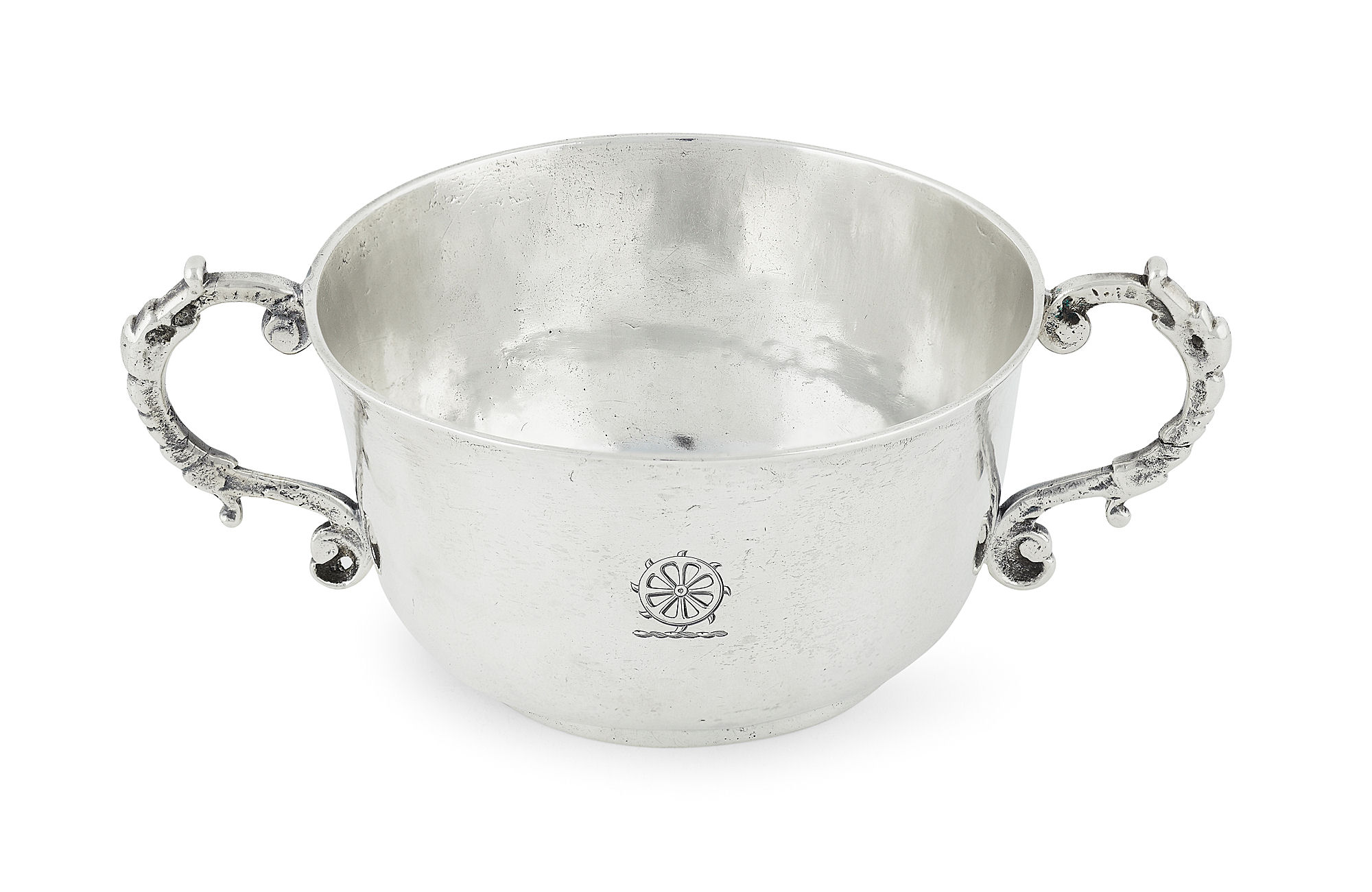 makers mark M with pellets and fleur de lys below, London 1660, the simple bowl with slightly everted rim and engraved with initials 'H / W*M / 1662' the reverse engraved with a crest, with twin cast figural handles