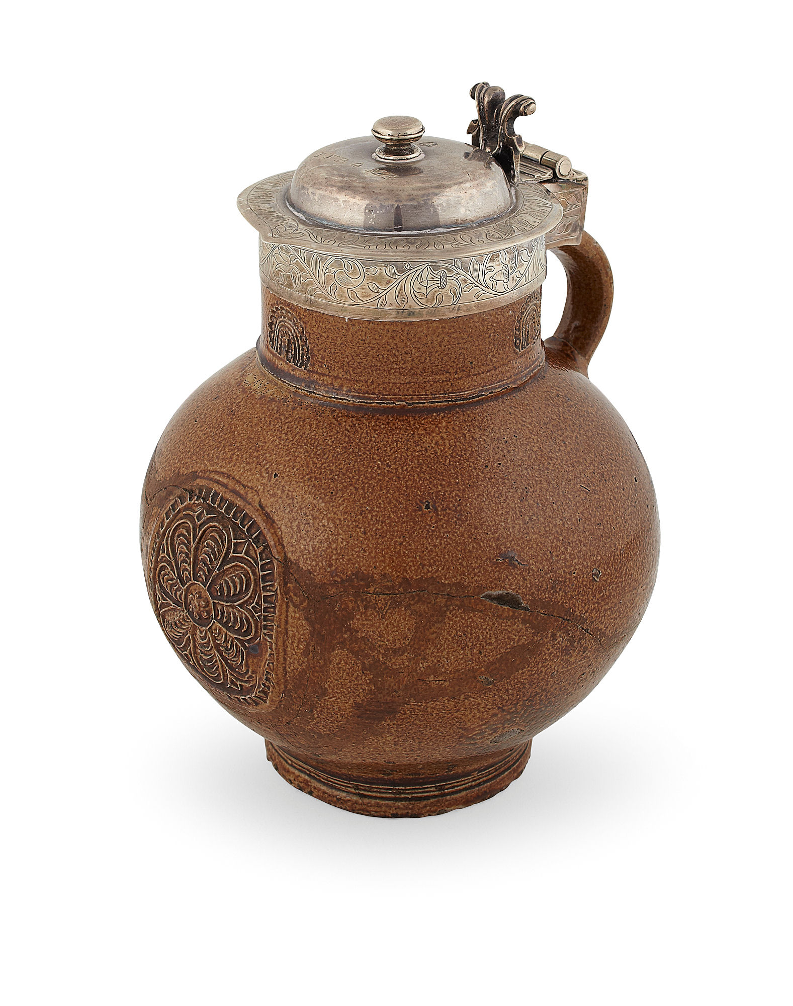 A Charles I/Commonwealth period silver mounted salt glazed stoneware jug