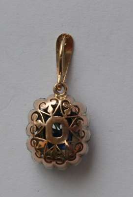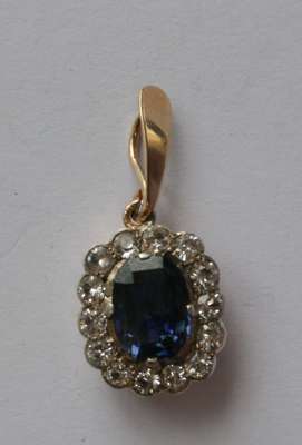 the oval blue sapphire of approximately 2.4cts, with a surround of fourteen circular cut white sapphires, all set in silver on a gold backing with delicate pierced detail, with a plain gold bale