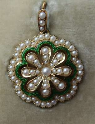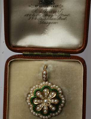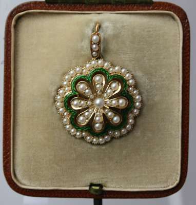 of lobed circular form, outer seed pearl border enclosing a green enamel border enclosing pearl set radiating arms, pearl set bale, and all in a fitted case for Stewart of Glasgow