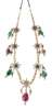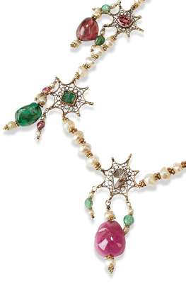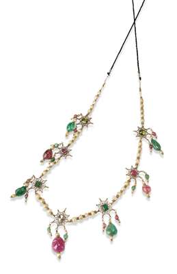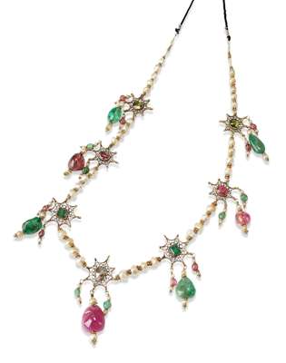 composed of freshwater cultured pearls, interspersed by gold beaded roundels, additionally set to the front with seven wirework scroll form stars, each collet set to the centre with either an oval cut peridot, oval cut pink tourmaline, trap cut emerald or pear rose cut diamond, each fringed by three graduated tassles set with graduated pink tourmaline, ruby and emerald polished pebbles, with bound gold thread tie-fastening