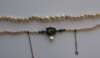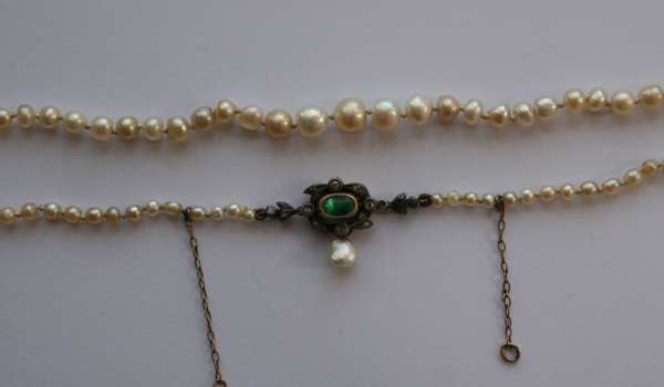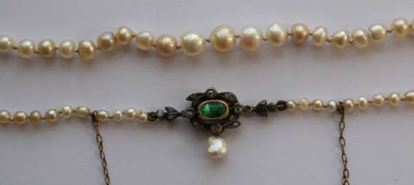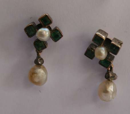 of irregular shape, with an emerald diamond and pearl set clasp, together with a pair of emerald and pearl set ear studs (pearls untested)