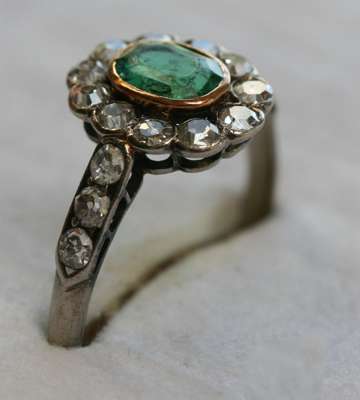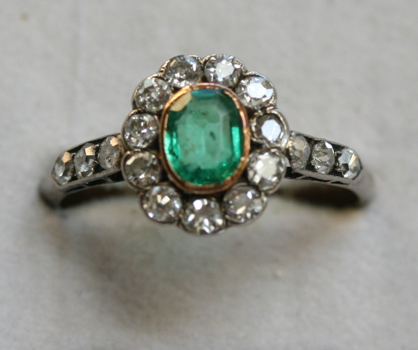 the oval cut emerald in yellow gold rubover setting, outer diamond claw set border of eleven diamonds, the shoulders each set three circular cut diamonds, white metal shank, pierced gallery