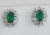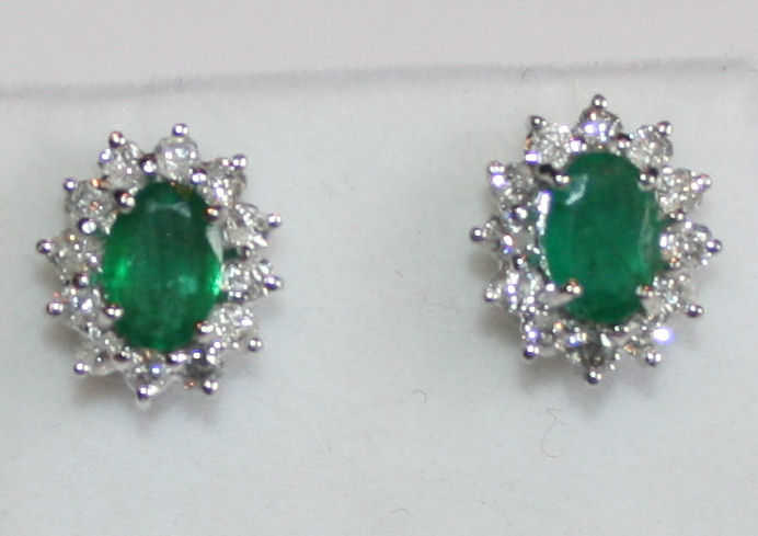 each claw set with an oval cut emerald of a pleasing strong green hue, within a surround of twelve similarly set round brilliant cut diamonds, with post and butterfly fittings