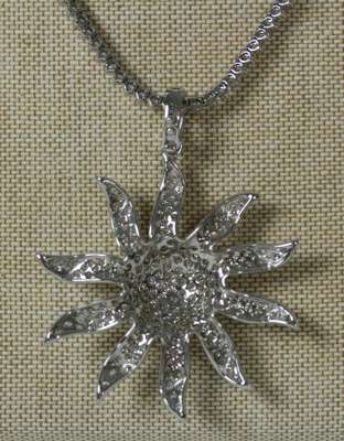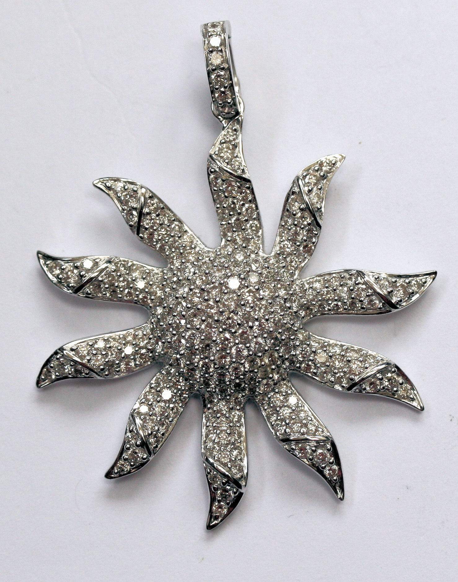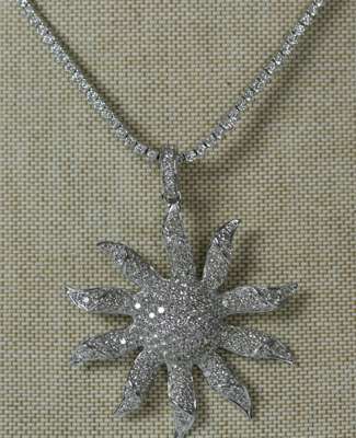 the necklace claw set with uniform round brilliant cut diamonds, suspending a sunburst form pendant with detachable bale, pave set with graduated round brilliant cut diamonds, pendant stamped D295 K18, necklace clasp stamped 750