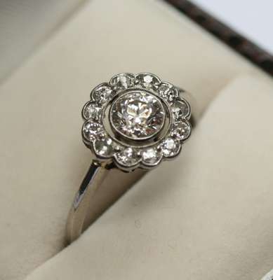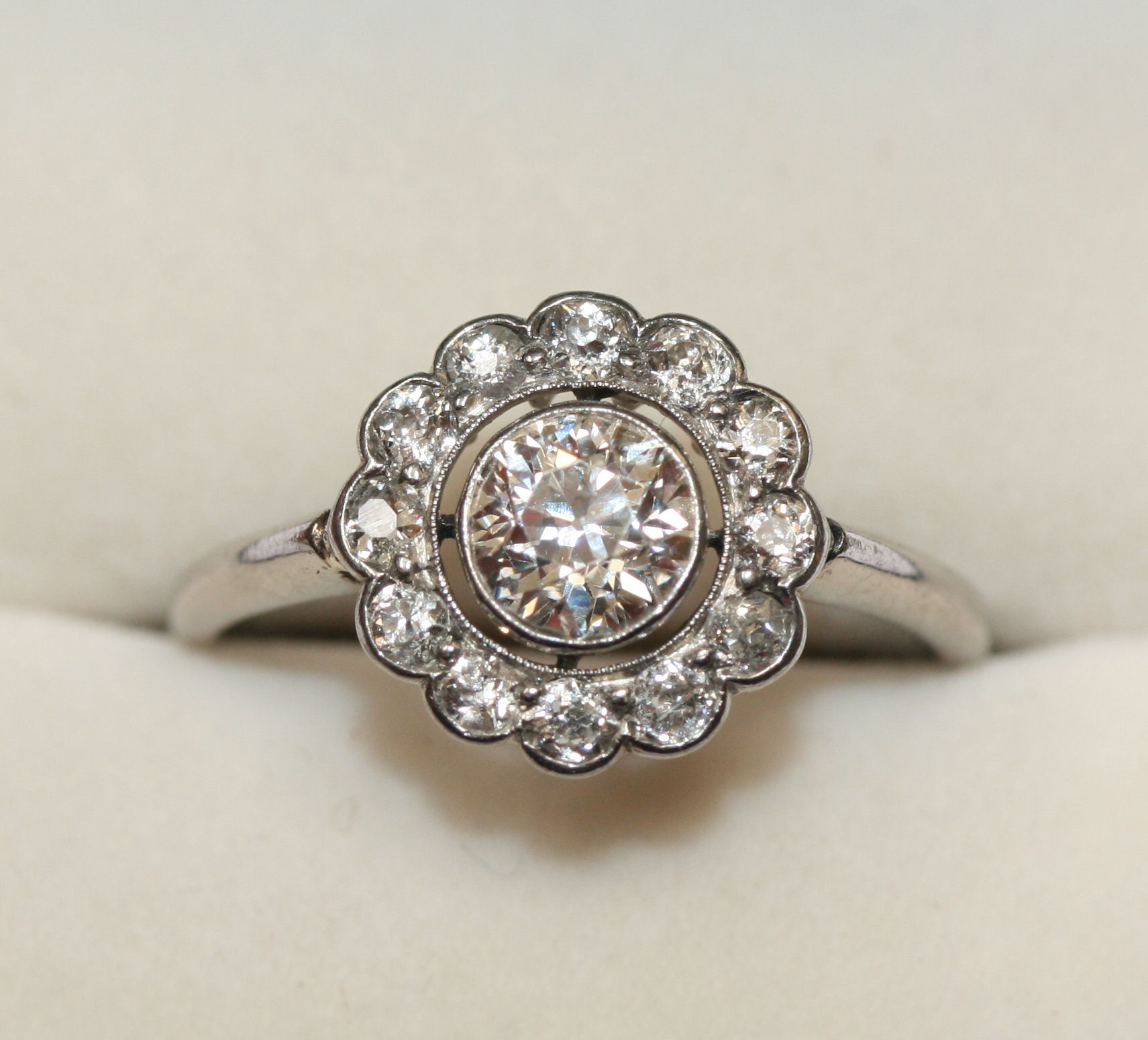 millegrain collet set to the centre with an early round brilliant cut diamond, within an open shaped circular surround set with twelve smaller similarly cut diamonds
