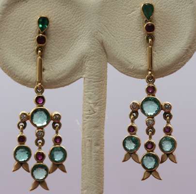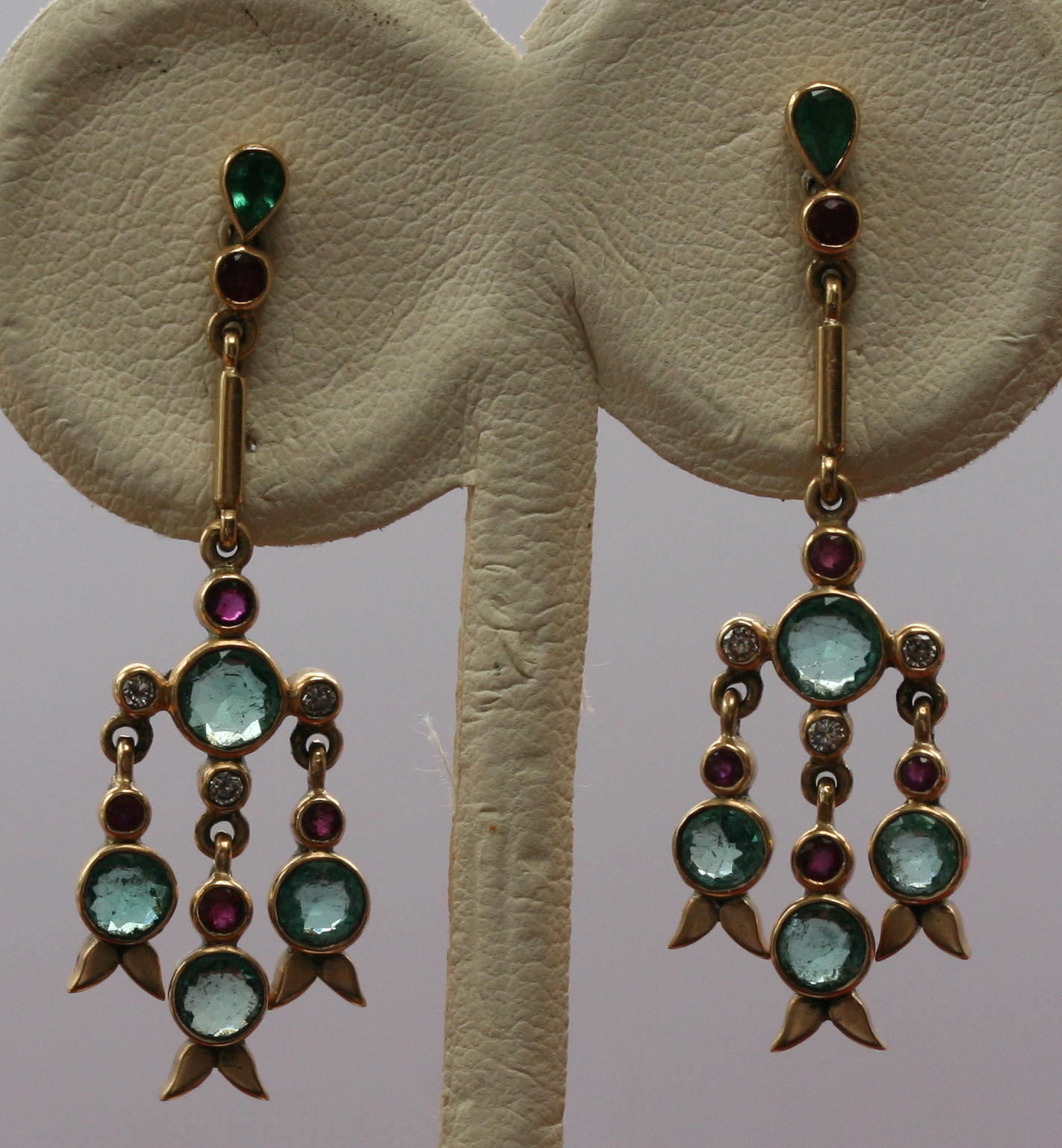 each of girandole design, composed of a collet set pear cut emerald surmounting a similarly set circular cut ruby atop a plain cylindrical link and three fringed drops each set with circular cut collet set emeralds, rubies and diamonds, with post and butterfly fittings