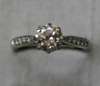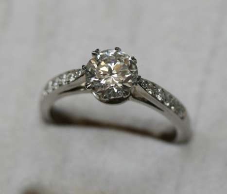 claw set to the centre with a round brilliant cut diamond, additionally set to each shoulder with six graduated similarly cut diamonds