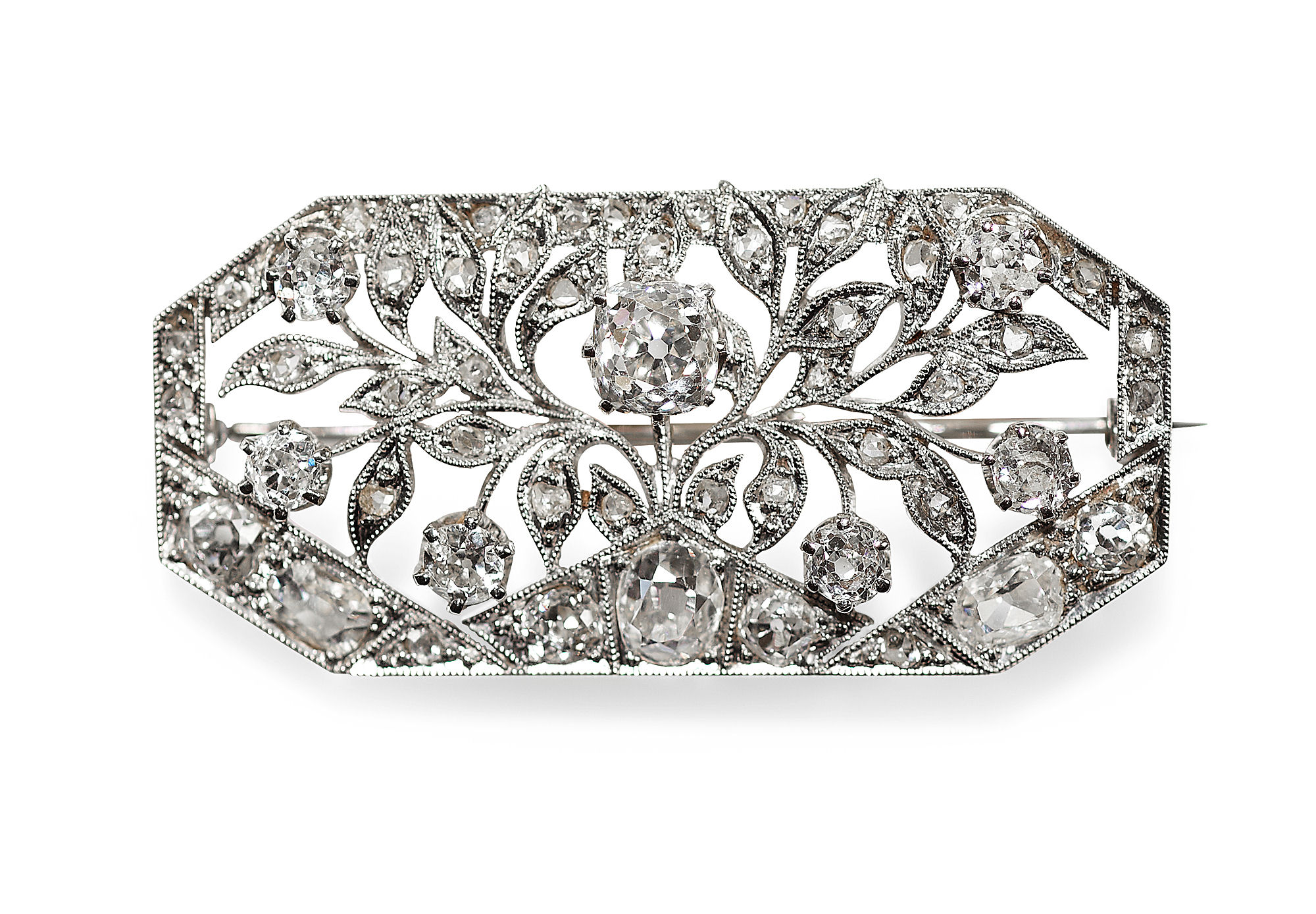 of pierced canted rectangular plaque form, composed of foliate scrolls, millegrain and claw set throughout with graduated old mine and rose cut diamonds, contained in a brown leather fitted case stamped WILSON & SHARP LTD, EDINBURGH…