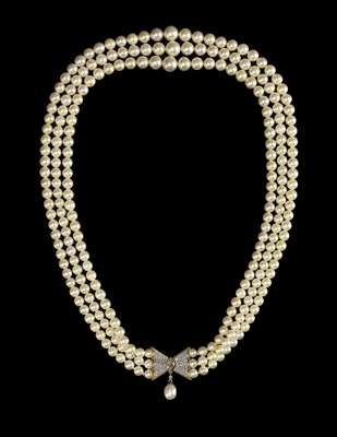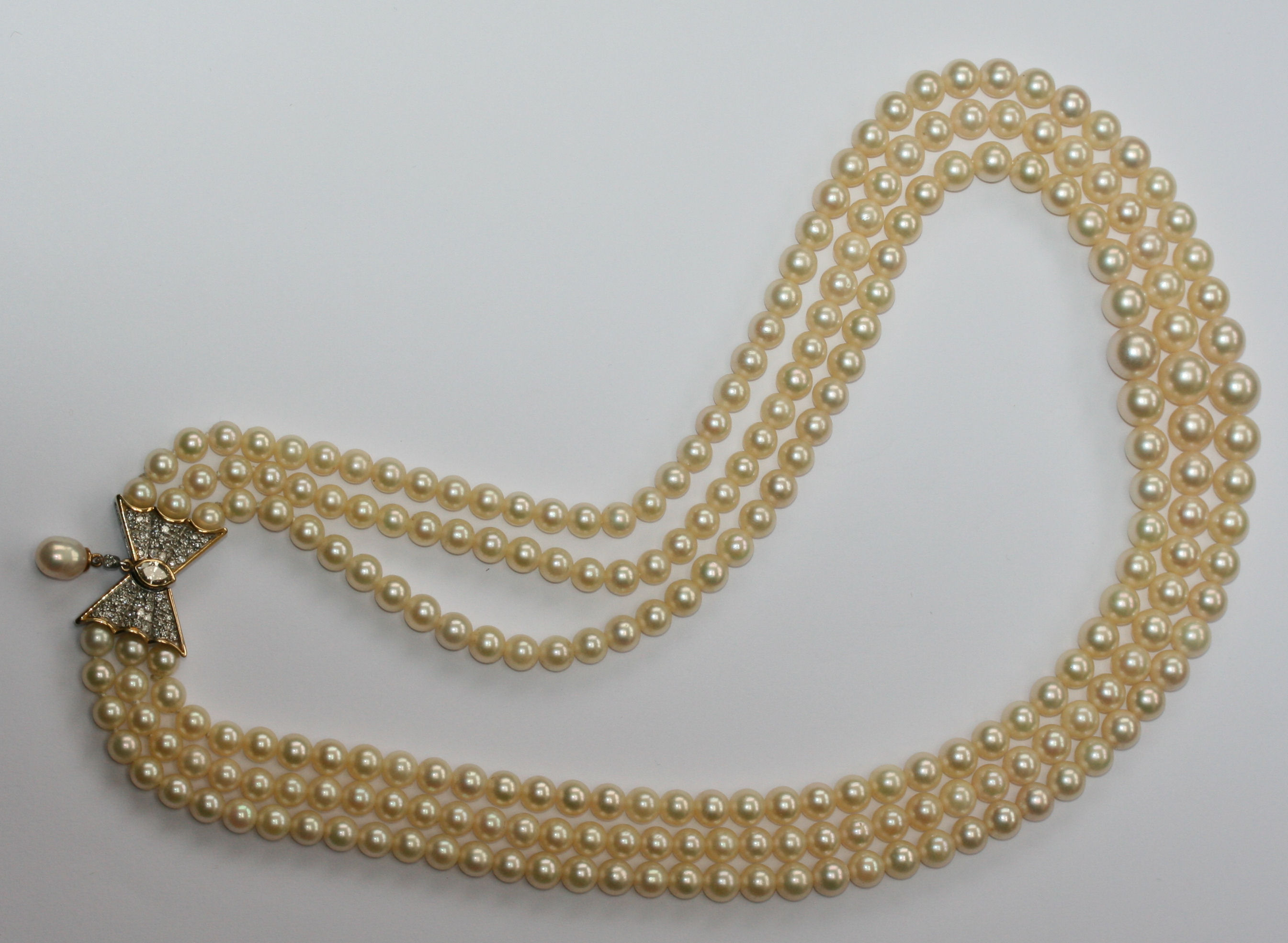 the necklace composed of three rows of graduated cultured pearls, ranging from approximately 5mm to 8.5mm diameter, the stylised bow-form clasp pave set with graduated round brilliant cut diamonds around the central collet set marquise cut diamond, suspending an ovoid cultured pearl drop, contained in a tooled blue leather fitted case, stamped THEO FENNELL LONDON