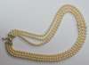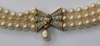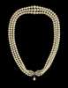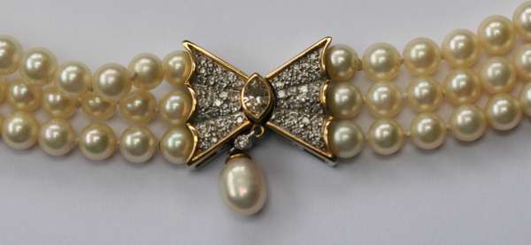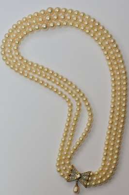 THEO FENNELL - A cultured pearl three-row necklace with diamond set clasp