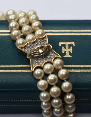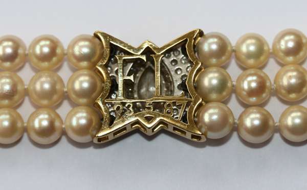 composed of three rows of cultured pearls, each measuring approximately 6.5mm diameter, with central stylised bow pave set with graduated round brilliant cut diamonds around the central collet set marquise cut diamond, the central panel pierced to reverse, initialled FL and dated 23 5 87, the rectangular clasp channel set with a border of round brilliant cut diamonds, cotnained in a tooled blue leather fitted case stamped THEO FENNELL LONDON