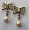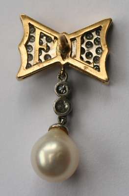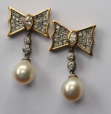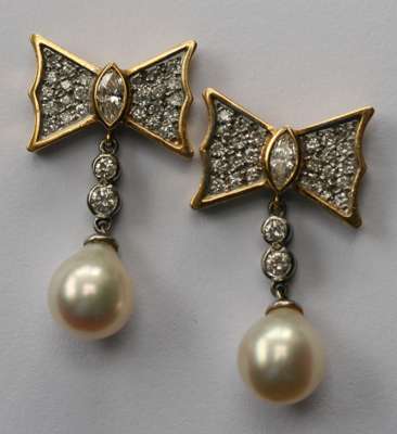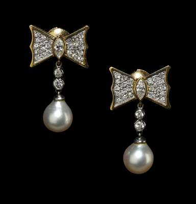 each composed of a stylised bow, pave set with graduated round brilliant cut diamonds around the central collet set marquise cut diamond, surmounting two graduated collet set round brilliant cut diamonds, suspending an ovoid cultured pearl drop, each measuring approximately 8mm diameter, with post and butterfly fittings, stamped 18K 750..., contained in a matched cream leather case stamped THEO FENNELL JEWELLERY