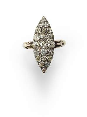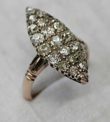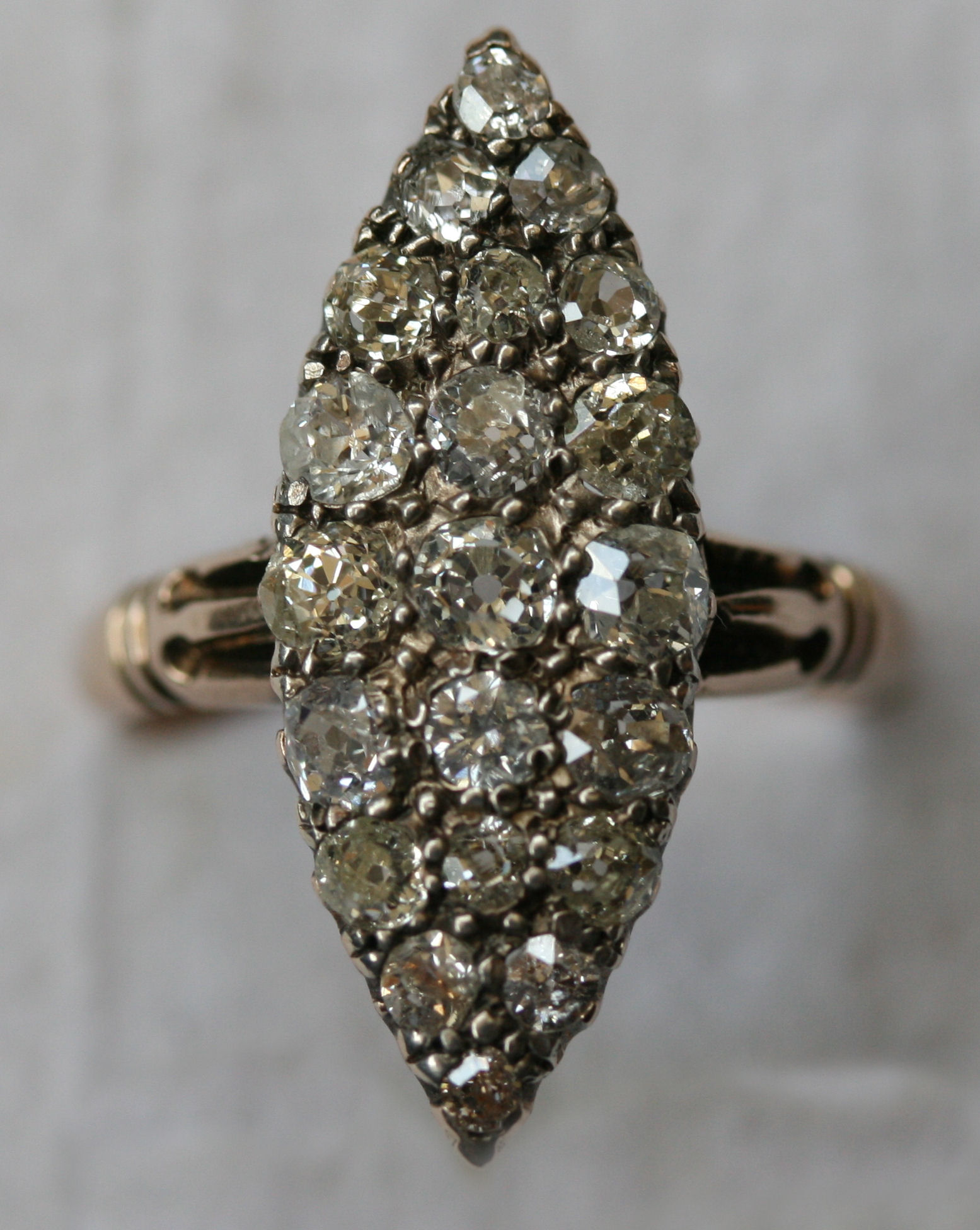 set with graduated old mine cut diamonds, shank stamped indistinctly probably 18ct