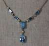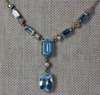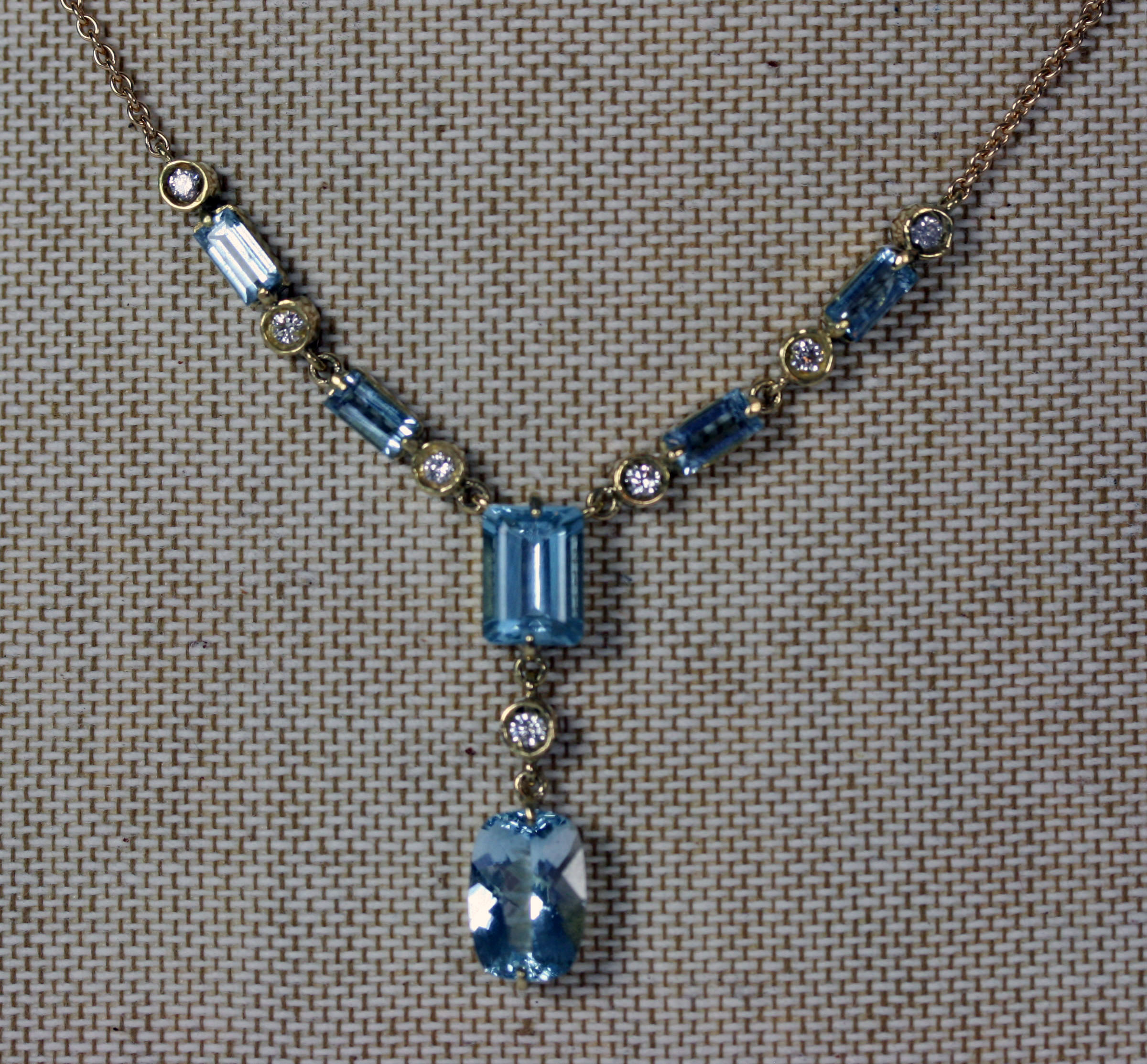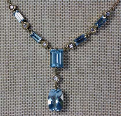 composed of fine belcher form links, set to the front with graduated baguette, trap and cushion cut aquamarines, interspersed by collet set round brilliant cut diamonds