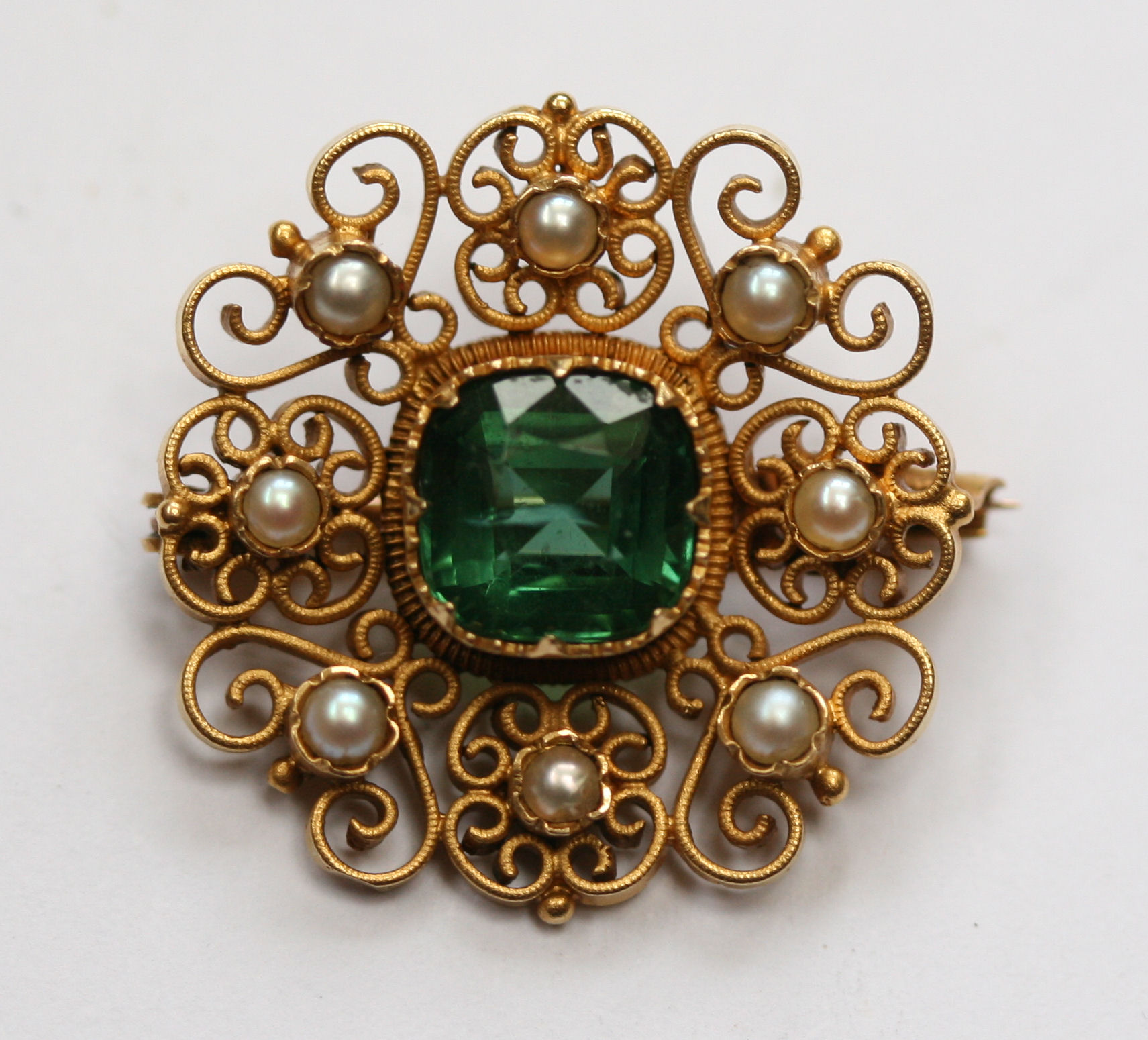 An Edwardian 9ct gold mounted green tourmaline and seed pearl set brooch