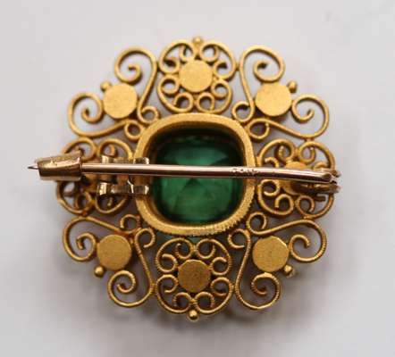 of scroll design set to the centre with a cushion cut green tourmaline within a border of scrolls and seed pearls