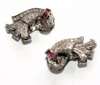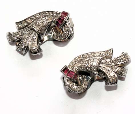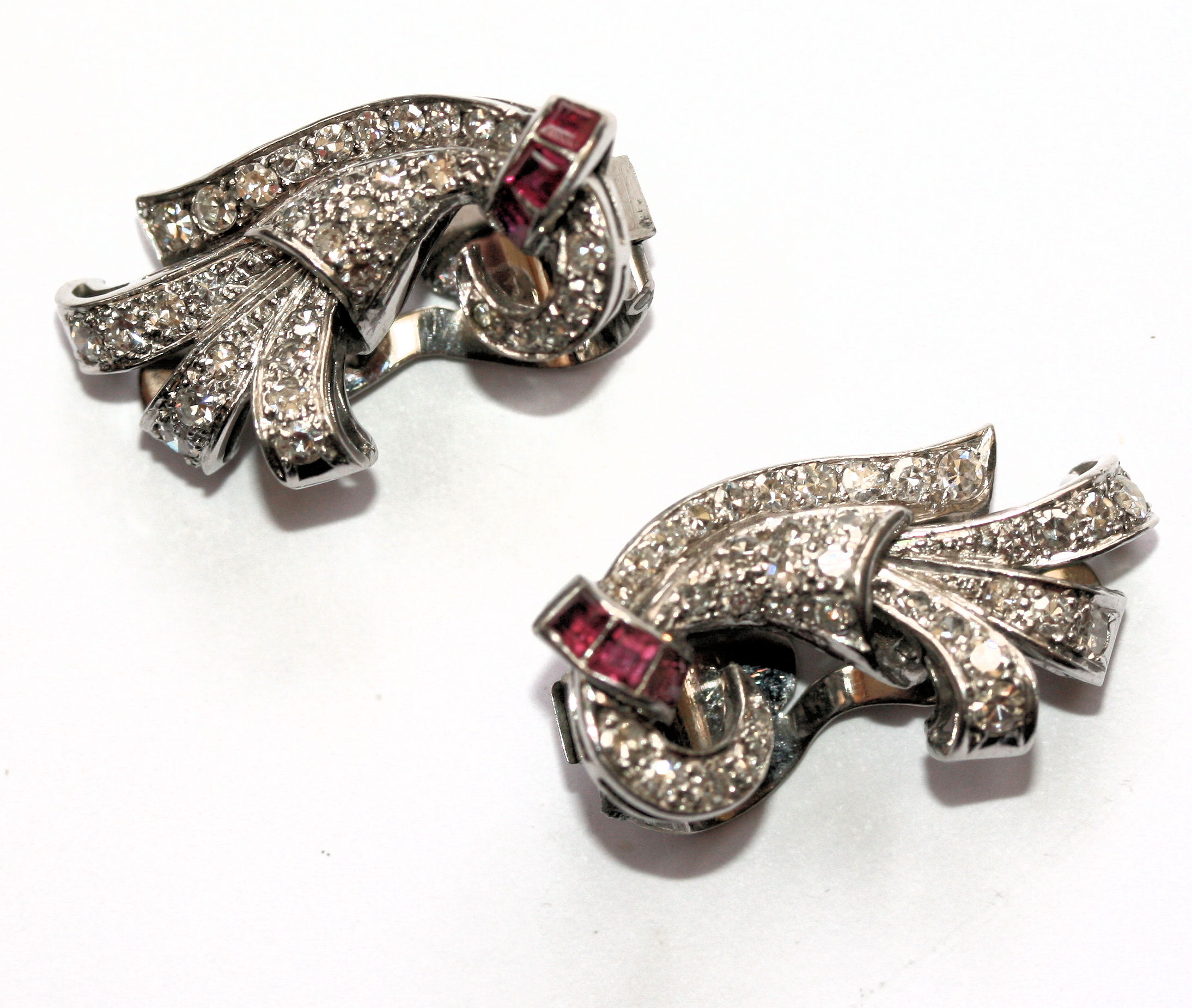 each designed as a stylised scroll, set with single cut diamonds applied with a border of square cut rubies, with hinged clip fittings