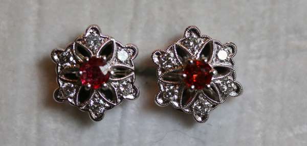 each claw set to the centre with a circular cut ruby within a pierced shaped circular surround millegrain set with round brilliant cut diamonds, with post and butterfly fittings, stamped 750