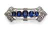 millegrain collet set with five graduated oval cut sapphires, of a pleasing strong-blue hue, within millegrain scroll form borders, flanked above and below by an old European cut diamond and additionally set to each side with three graduated similarly cut diamonds .