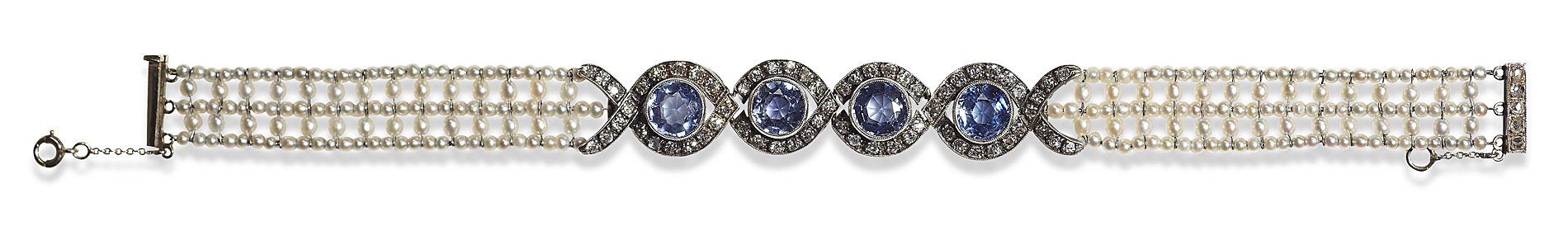 millegrain collet set to the centre front with four circular cut sapphires within scrolling border of old European cut diamonds, flanked to either side by rows of seed pearls with rose cut diamond set clasp and safety chain