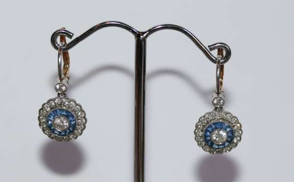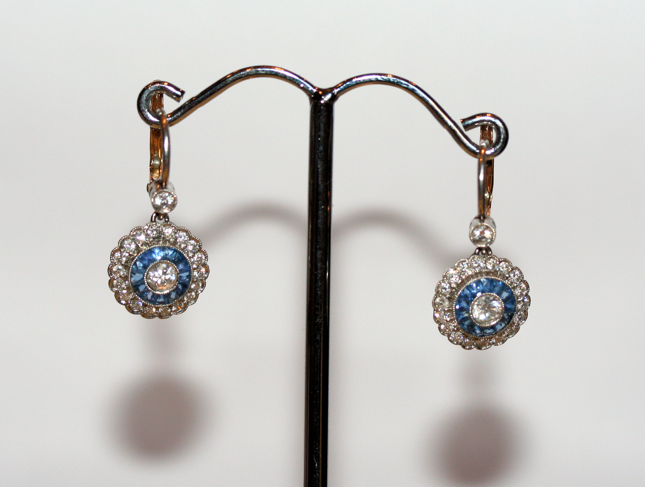 each composed of a millegrain collet set early round brilliant cut diamond, within a circular border of French cut sapphires and an outer border of smaller early round brilliant cut diamonds, surmounted by a larger similarly cut diamonds, with hinged wire fittings
