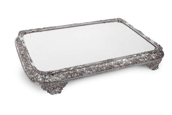 unmarked, of rectangular outline the mirrored centre with clasped reeded rim with shell corners above trailing fruiting vine decoration, all raised on large cast scroll bracket feet