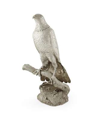 with London import marks JS, 1898, naturalistically formed as a falcon perched on a branch above a natural wooden stump base with applied oak leaves, lizard and turtle