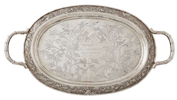 with character mark and TOK SING, of oval outline with border of birds within bamboo and twin loop bamboo formed handles, the centre with engraved border of presentation names and inscription 'In token of the hospitality shown during his tenure of the No1 District, Canto-hankow Railway Huper Hunan Section'