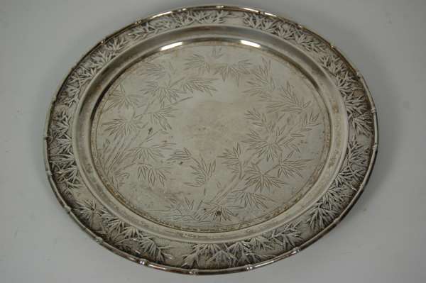 marked LUENWO and character mark, of circular outline with embossed bamboo border the centre engraved with bamboo, raised on compressed feet