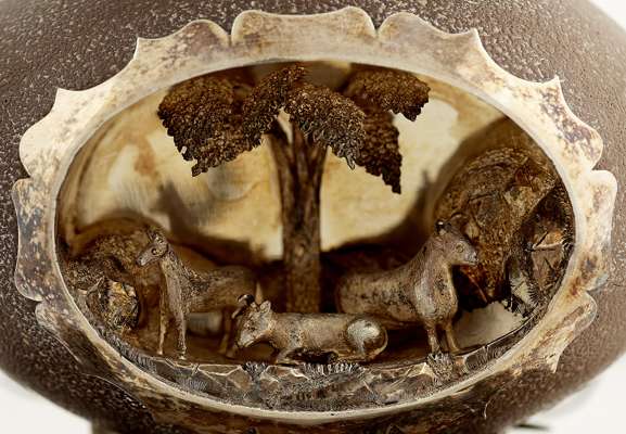 Joachim Matthias Wendt, Adelaide, the egg with scene of cattle and horses in a natural landscape and with bird finial, raised on tree trunk stem and set on spreading oval base with kangaroo's and emu's on naturalistic ground, raised on a wooden plinth