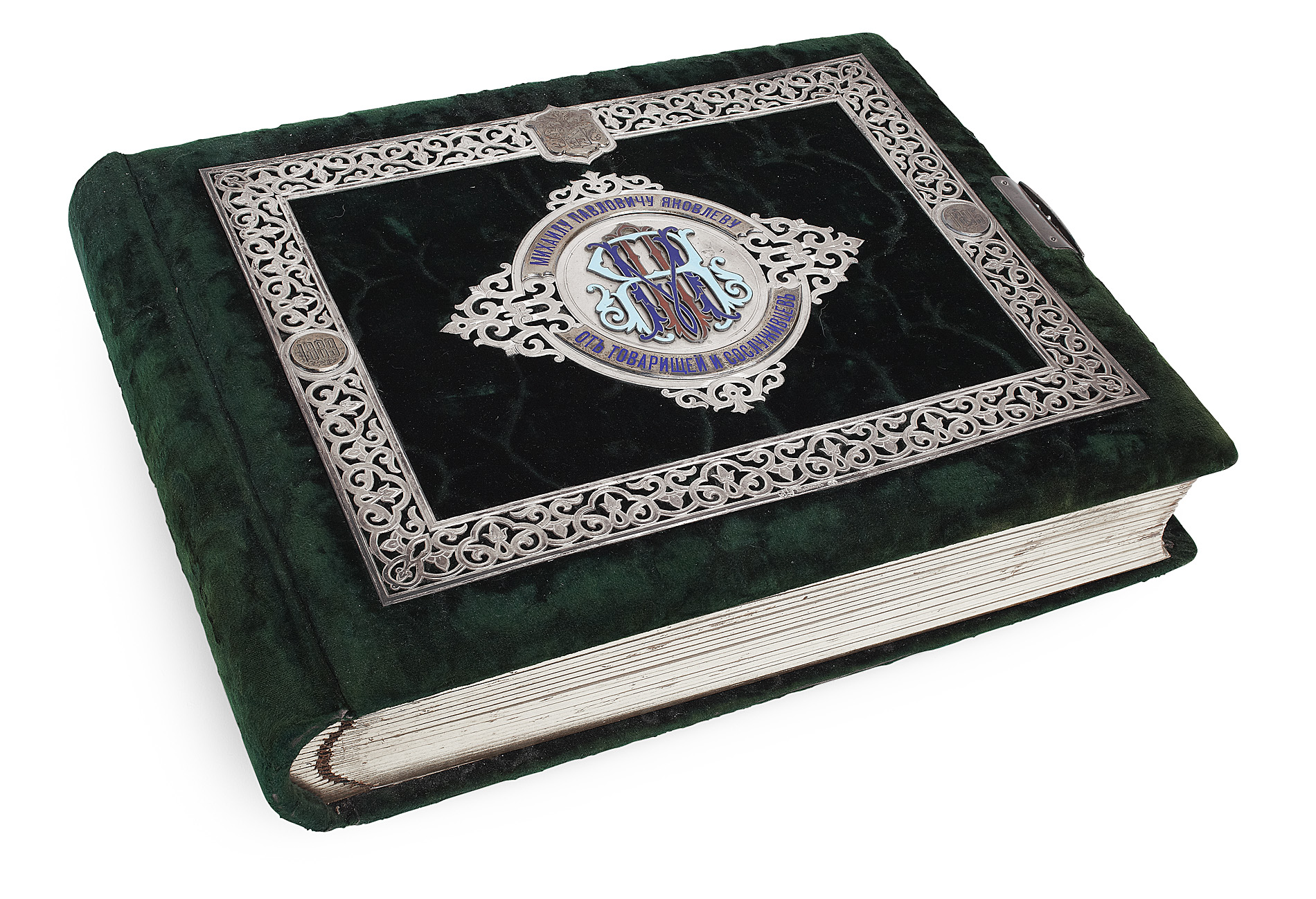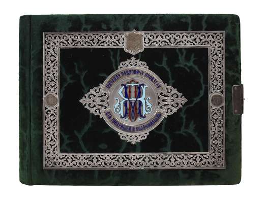 Ivan Khlebnikov, Moscow circa 1895, the velvet covers with a frame work of cut scroll work, central gilt armorials, two discs with 1889 and 1895, enclosing a central panel with large enamel work monogram to the centre and Cyrillic script above and below.......... the interior with cut sections for photographs on card, pierced silver clasp, the whole resting on four silver dome feet