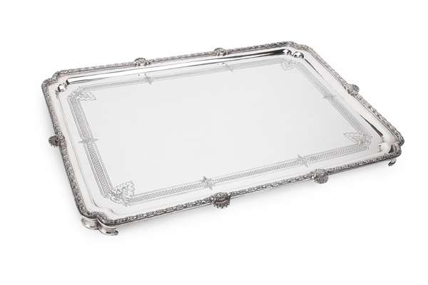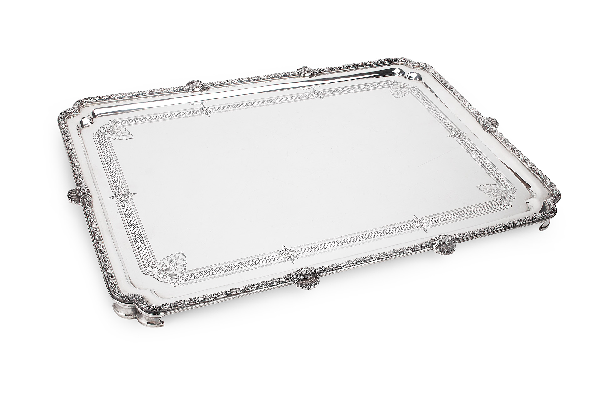 Garrard, London 1959, of rectangular outline with well moulded and cast border with shell details, the inner border of engraved lattice and stylised quatro foils interspersed, raised on four corner bracket feet