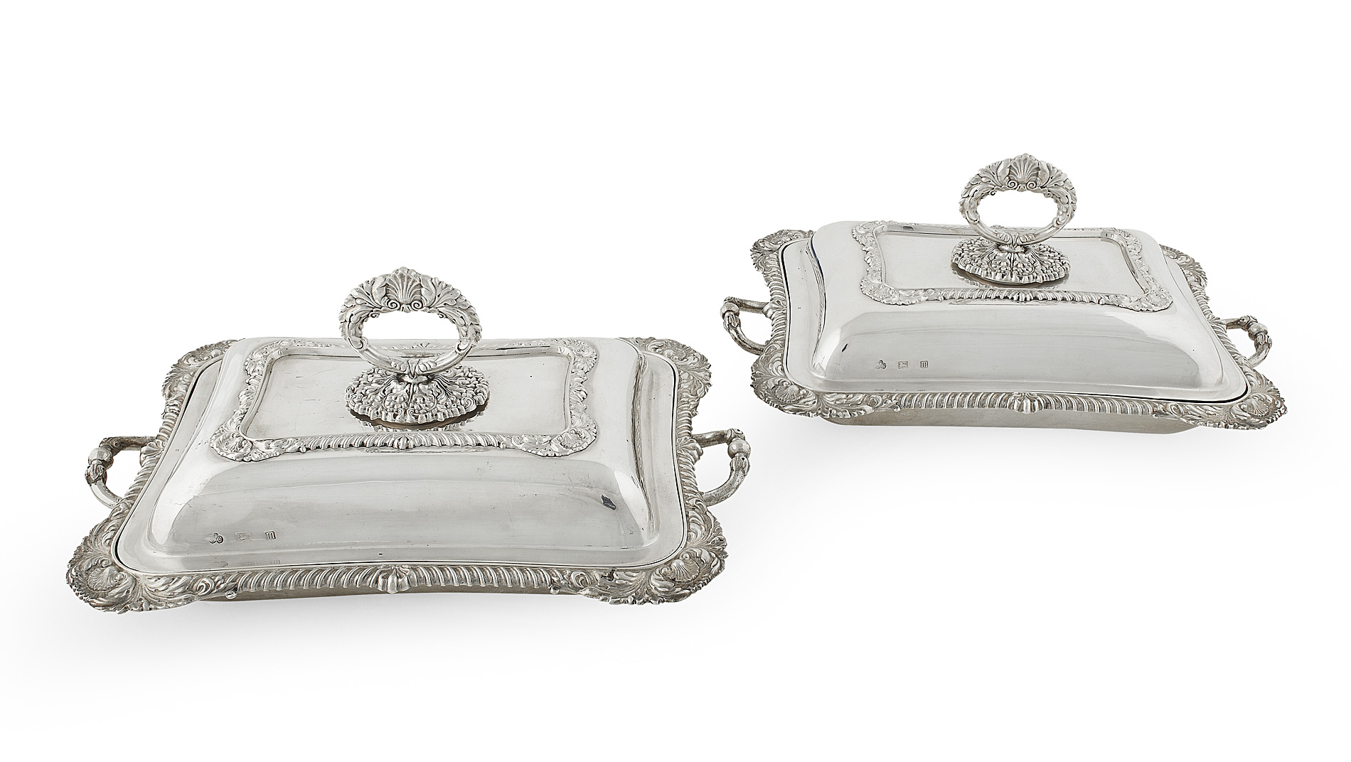 Elkington & Co. Birmingham 1911, of shaped rectangular outline with gadrooned borders with acanthus and shell detail to corners, the base with simple twin loop handles and the lift of covers with central loop handle (2)