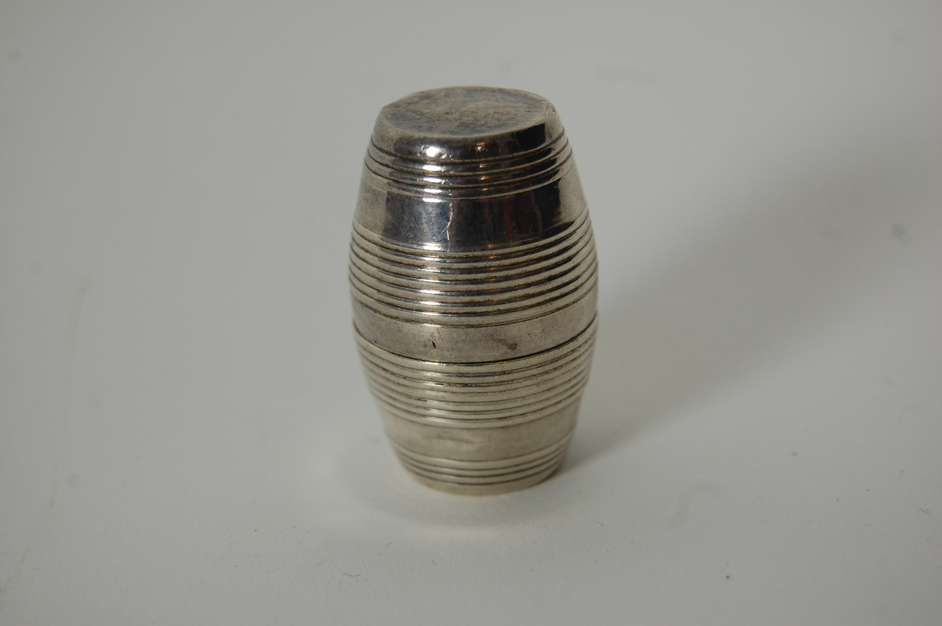 SM London 1815, of barrel form with four bands of reeded decoration and screw off cover