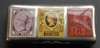 George Heath, London 1890, additionally engraved to back edge 'Rd No 154120, A BARRETT & SONS MANUFACTURER 63 & 64 PICCADILLY LONDON W' the rectangular box with hinged cover decorated with three enamelled Victorian stamps, the interior gilt with three sprung compartments