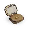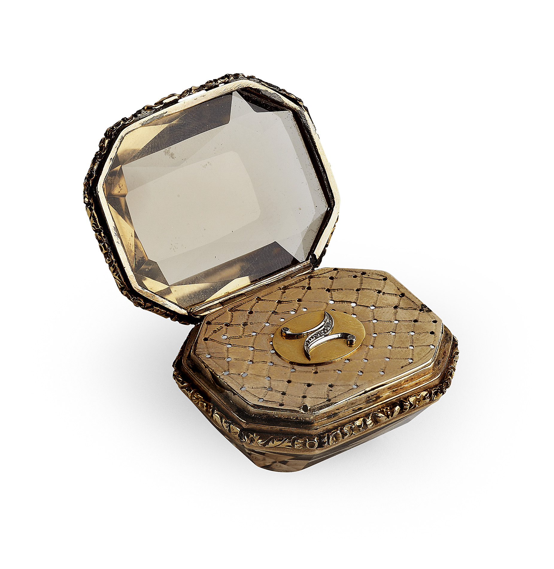 the cover and base formed from and octagonal facetted citrine, set in unmarked yellow metal floral mounts, the hinged grill with simple piercing and engraved lattice decoration mounted with a diamond set N to centre