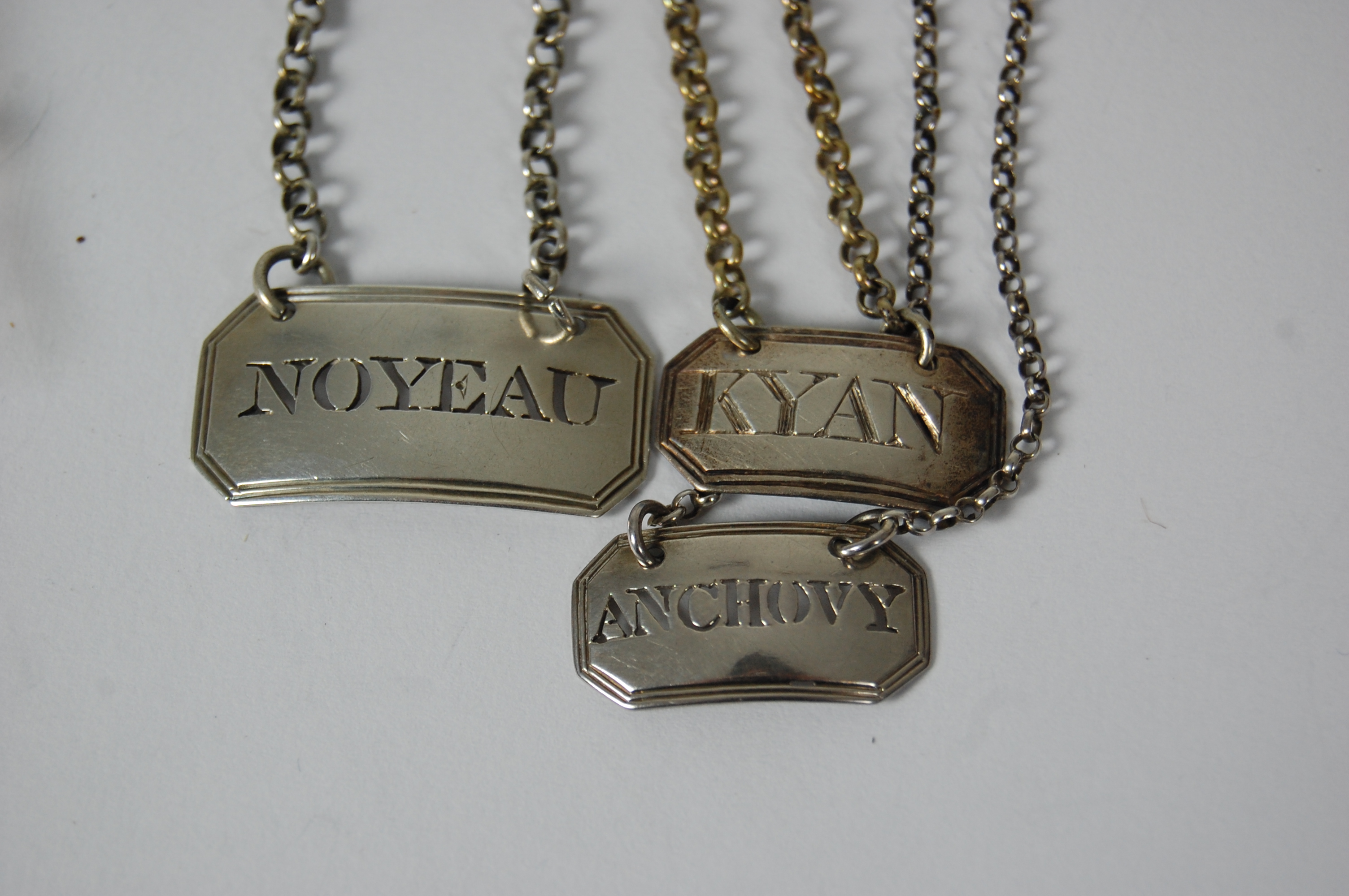 to include, a small canted rectangular example inscribed KYAN, makers mark only Phipps & Robinson; a canted rectangular example pierced ANCHOVY, John Reily London 1803; and a small wine label of canted rectangular form inscribed NOYEAU, John Reilly London 1801 (3)