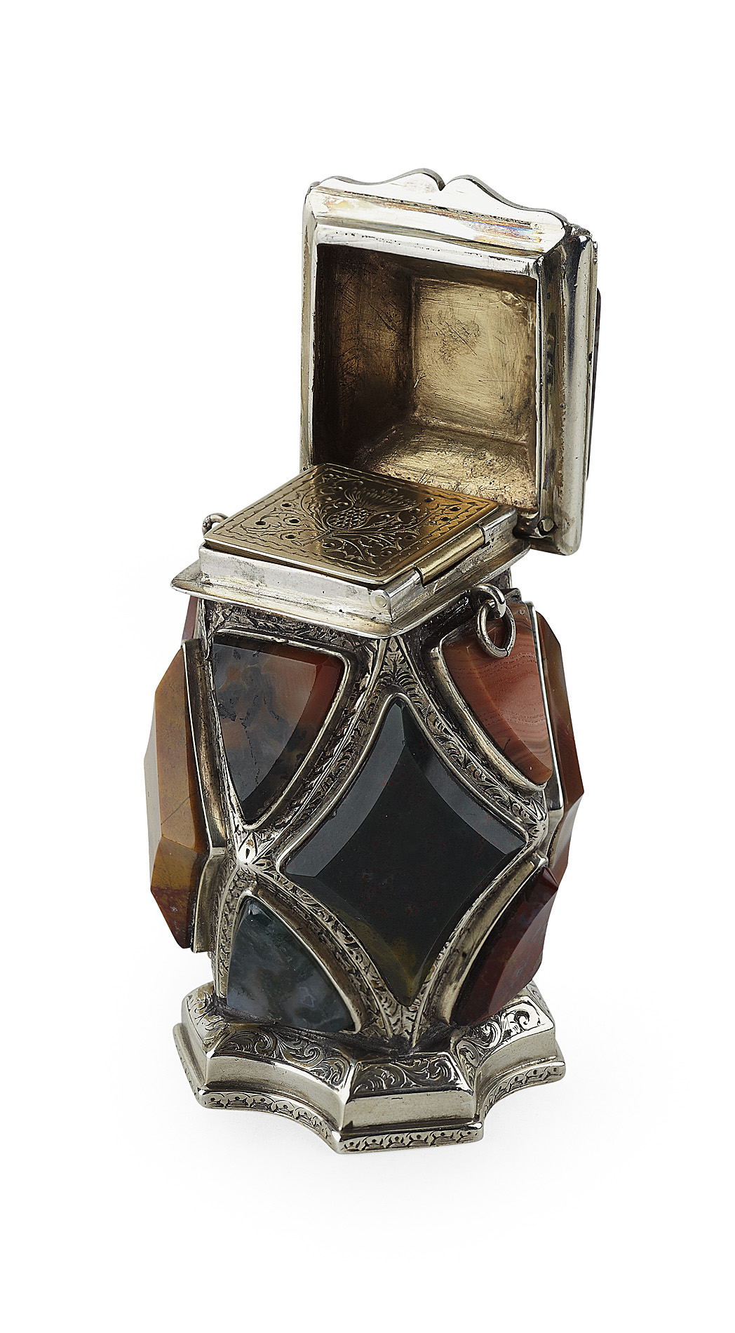 apparently unmarked, the body of bombe form set with various agates and hard stone panels, the hinged cover similarly set, the pierced an engraved grill with thistle decoration