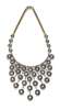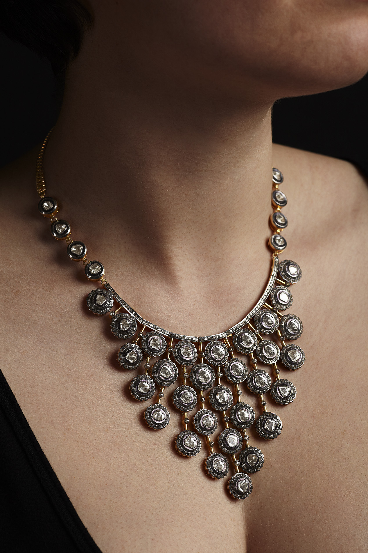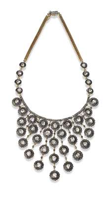 of fringed design, the tapering front composed of shaped circular clusters each collet set to the centre with a diamond macle within a black enamelled border and outer border of single cut diamonds, with closed back settings, conjoined by knife bars, suspended from a fancy link chain, the rectangular clasp set with two rows of single cut diamonds, with safety clip