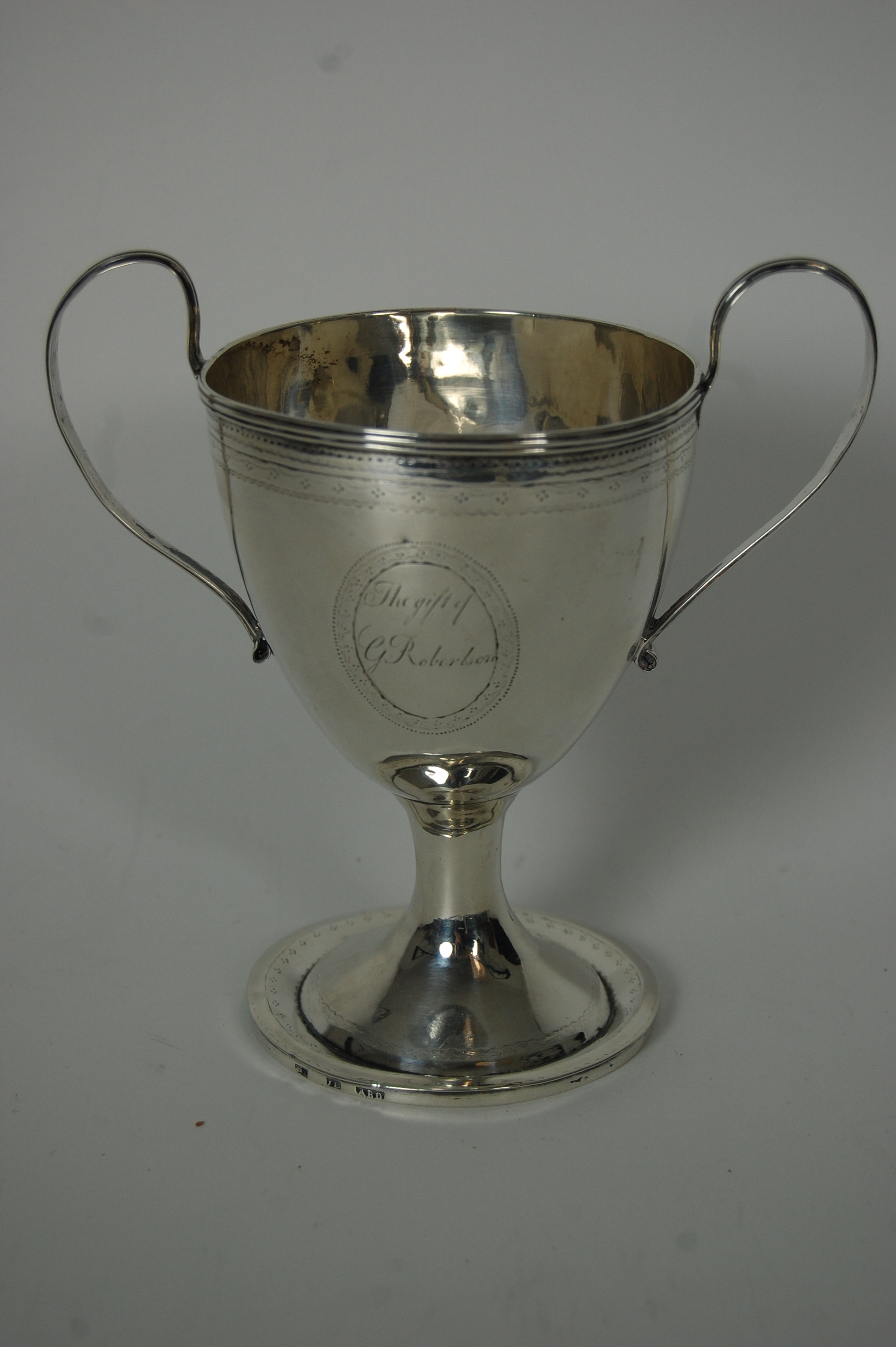 James Erskine, marked IE, IE, ABD, the deep tapered bowl with engraved borders and twin oval cartouche, engraved in script 'The gift of G ROBERTSON' and to opposing 'To Frances Julian Robertson 1798' with twin strap handles and waisted stem and spreading foot