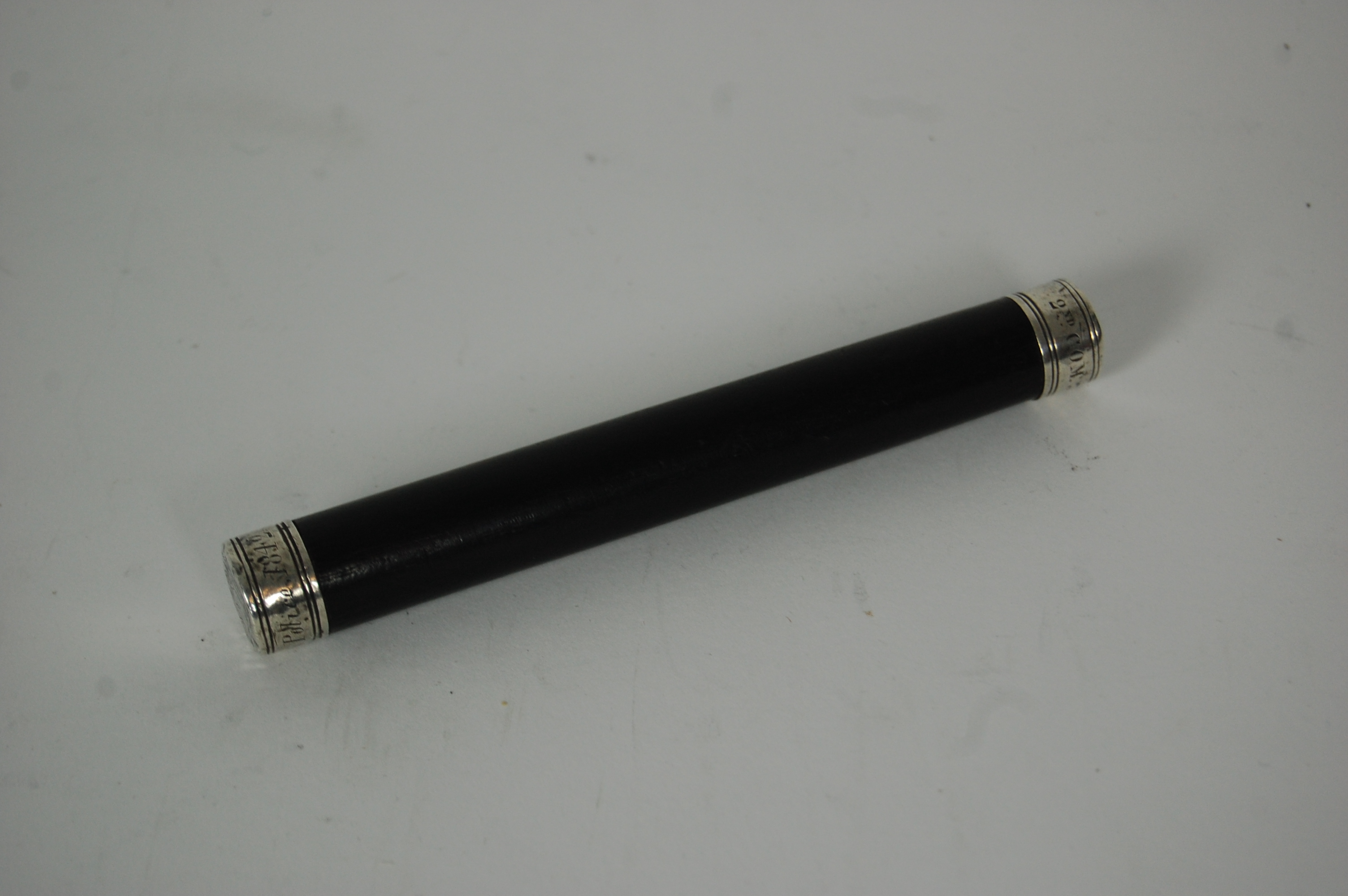 mounts unmarked, the ebony shaft of simple cylindrical form with twin caps to terminals, one with engraved cypher and crown above and inscribed '2nd COM 3rd WARD', the the other engraved with town arms and inscribed 'Leith Police 1842'