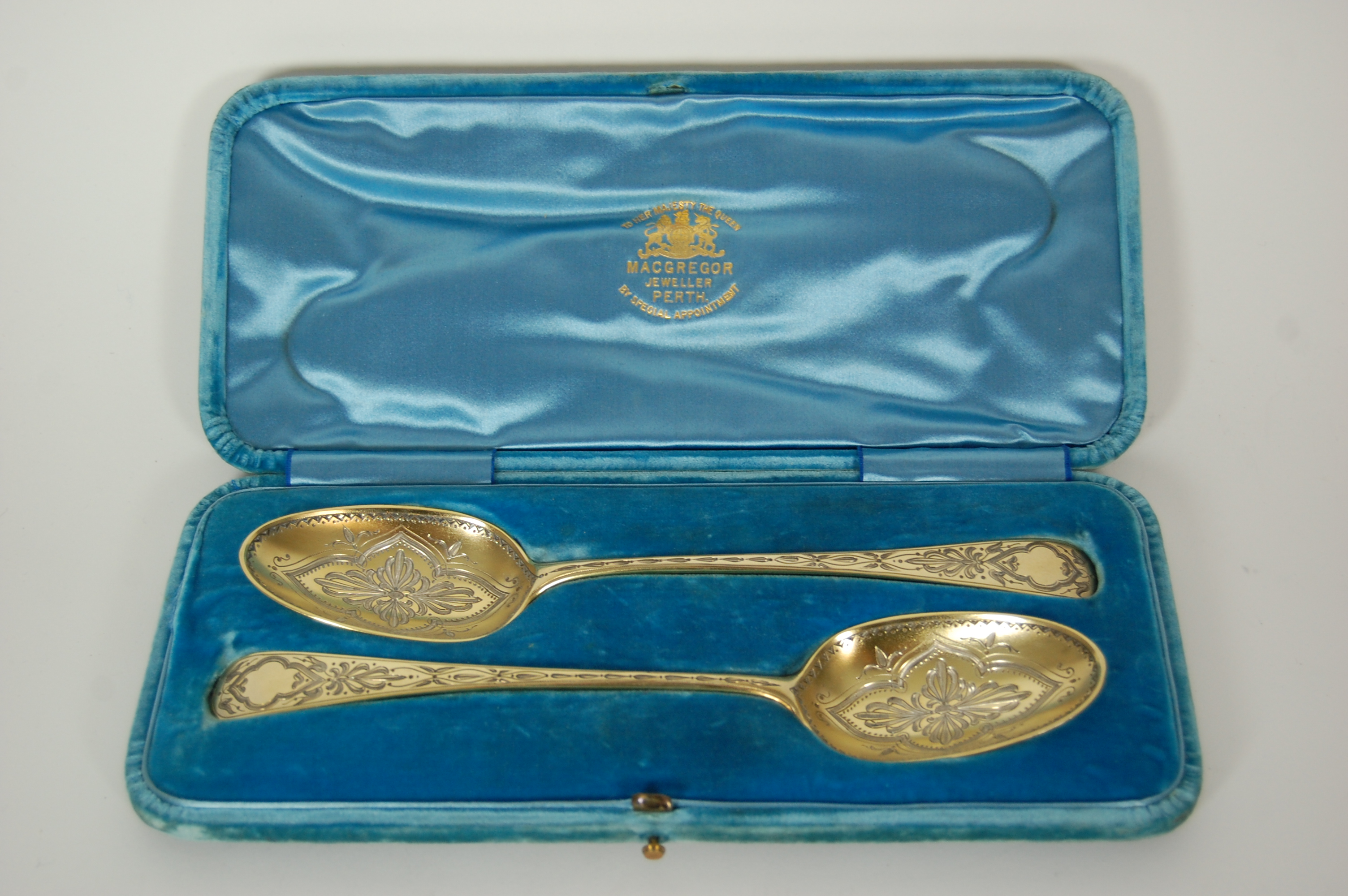 Perth - a pair of Scottish provincial silver gilt berry spoons