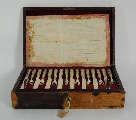 WM / AM (maker unidentified), Glasgow 1831, comprising twenty four pairs of King's pattern fruit knives and forks, each with engraved initial B in gothic script, with simple blades and tapered four pronged forks, in original fitted case with two lift out trays