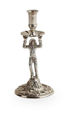 David Marshall, Edinburgh 1795, the stem formed from a cast figure of harlequin with arms raised holding a scalloped dish with sconce centrally set, the whole on a domed base with foliate and scroll decoration