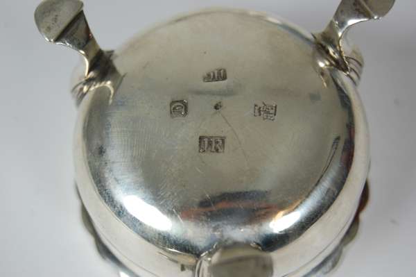 John Robertson, Edinburgh 1758, Assay Master Hugh Gordon, of conventional open form with everted 'thumb print' border and raised on three stepped hoof feet, the body with engraved initials A+W (2)