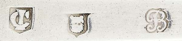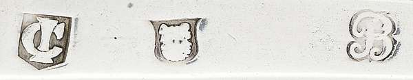 While the marks struck to these spoons are without doubt unusual it is interesting to note that they are first recorded by Sir Charles Jackson in 'English Goldsmiths and Their Marks', when owned by Edinburgh silversmiths Crichton and seen in conjunction with a 1682-83 date letter 'b'. There seems little explanation for what appears to be a deliberate attempt to copy an official London town mark as the statutes in Scotland and their marks were well established by this time. When these spoons previously appeared on the market there was discussion that there had been some confusion in the implementation of the new date letter cycle in 1681 (much like with the 'ABC' mark found in Aberdeen) and the thought that a London style town mark was needed, this seems highly unlikely.