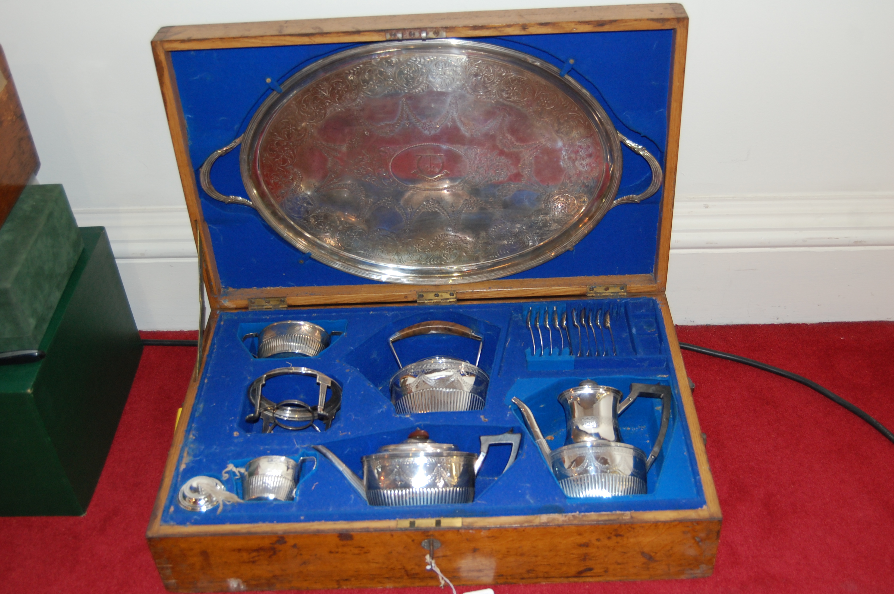 retailed by Elkington, London 1881, comprising oval twin handled tray, coffee pot, spirit kettle (on stand with burner), teapot, twin handled sugar bowl and milk jug, each with engraved foliate borders and with gadrooned lower sections of body, contained in original fitted case; together with a matched set of eleven teaspoons