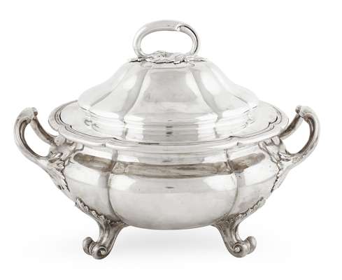 Paul Storr, London 1836 (to cover and base), additionally marked to base STORR & MORTIMER 279, of shaped circular lobed form with twin acanthus clasped loop handles, the pull off domed cover with naturalistically form loop handle; contained in a later fitted case with Victorian Fiddle pattern soup ladle London 1837