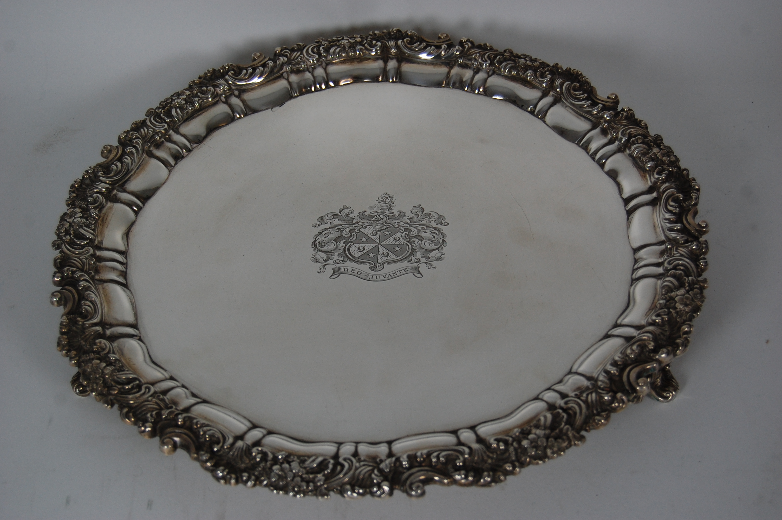S Younge & Co, Sheffield 1820 of shaped circular form with bold deep flowerhead and scroll border, the centre engraved with armorial and motto, raised on three acanthus bracket feet